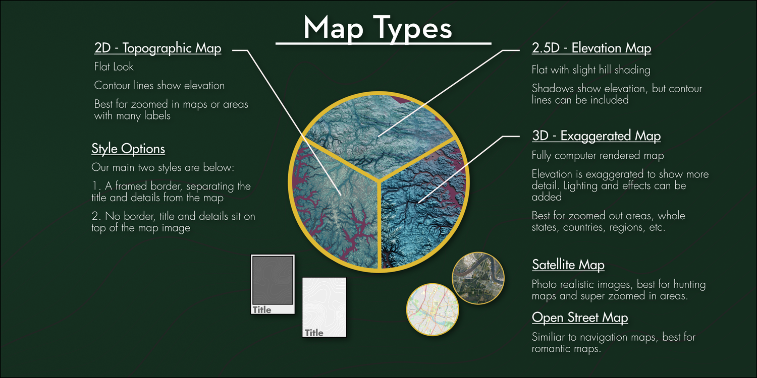 - 1. Get Inspired - If you don't have a map style or location in mind, check out our other designs below to see our main styles. The main things to consider are the map type and frame (see picture on the right) map types